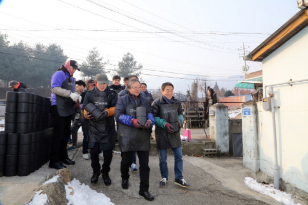 포이보스 연예인골프단은 지난 15일 경기 연천군을 방문, 연탄 1만장(600여만원 상당)을 전달하고, 회원 16명이 참석한 가운데 연탄배달을 진행했다. 사진은 단장인 배우 정동환씨 등 관계자들이 연탄을 배달하고 있는 모습. (사진제공=연천군청)