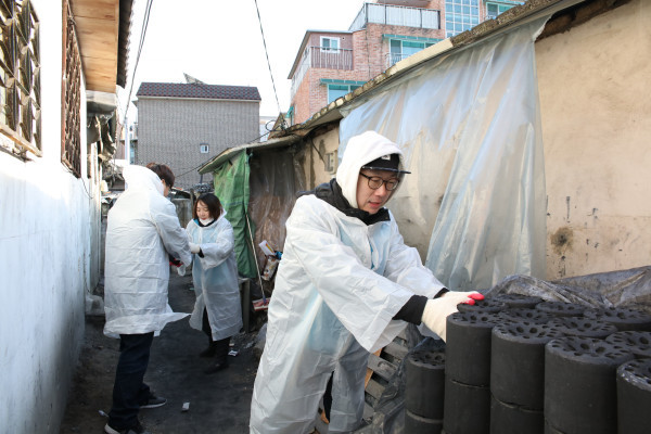 경기 성남시청소년재단은 연말연시를 맞아 어려운 이웃의 따뜻한 겨울을 위해 지난 15~16일 '사랑愛 따뜻함을 나눠yo!!' 연말 나눔활동을 실시했다. 사진은 재단직원이 이웃에게 연탄을 전달하는 모습. (사진제공=성남시청)