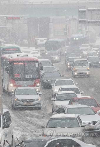 서울 등 수도권에 대설주의보가 발효되며 폭설이 내린 18일 서울 동작구 사당역 인근에서 차량들이 거북이운행을 하고 있다.