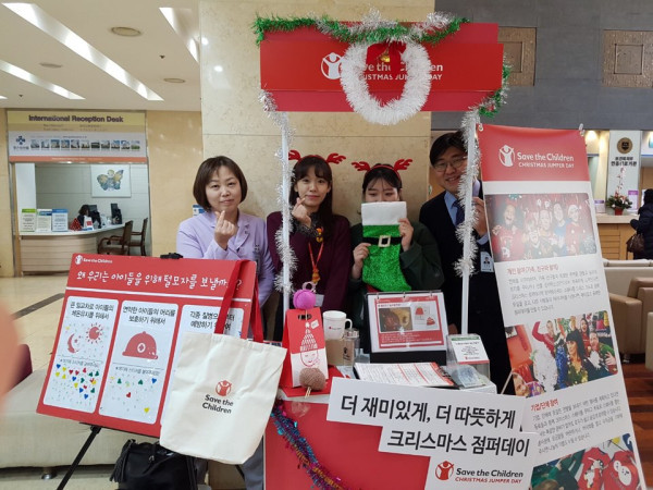 은성의료재단 산하 부산지역 좋은문화병원, 좋은삼선병원, 좋은강안병원은 지난 15일 세이브 더 칠드런과 함께 ‘크리스마스 점퍼데이 행사’를 진행했다. 사진은 행사에 참여한 관계자들이 부스에서 행사를 홍보하는 모습. (사진제공=은성의료재단)
