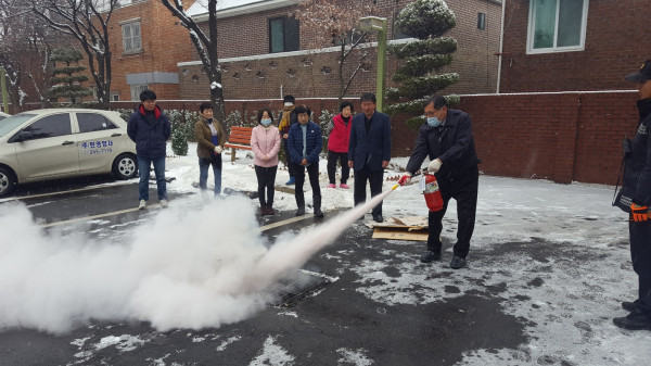 경기 수원시 권선구 세류1동은 18일 고색119안전센터와 함께 주민 등 20여명이 참여한 가운데 합동소방훈련을 실시했다. 사진은 참여자들이 소화기 사용법에 대해 배우고 있는 모습. (사진제공=권선구청)