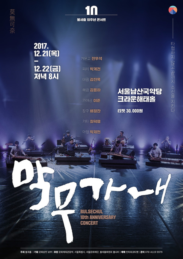 ‘불세출 10주년 콘서트 <막무가내(莫無可奈)>’는 그간 창작음악의 밀도를 높여 한층 세련된 연주를 구성했으며, 이번 무대를 위해 준비한 신곡도 발표될 예정이다. 불세출은 전통음악의 장단을 기반으로 각 연주자의 기량에서 완성도를 높이는 공동창작 방식을 꾸준히 이어오고 있다.
