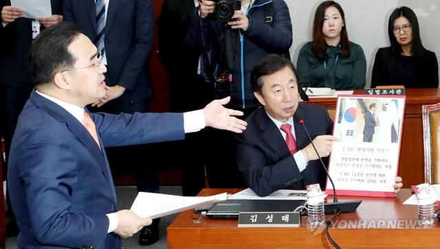더불어민주당 박홍근 원내수석부대표가 19일 오전 국회에서 열린 운영위원회 전체회의에서 자유한국당 김성태 원내대표의 의사진행 발언 때 일정 협의 없이 자유한국당에서 일방적으로 회의를 개회했다며 항의하고 있다. 이날 회의는 자유한국당측은 임종석 대통령 비서실장의 UAE특사에 대한 문제를 질의하기 위해 열었다고 주장했으며 더불어민주당은 일체의 안건 협의가 없었다고 주장했다.