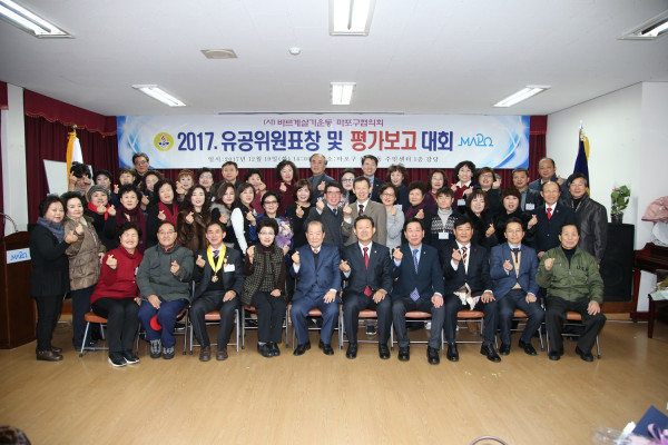 19일 오후 마포구 성산1동 주민센터 강당에서 바르게살기운동 마포구협의회 평가보고회가 열렸다. 사진은 행사에 참여한 내빈들이 기념촬영을 하고 있는 모습. (사진제공=마포구청)
