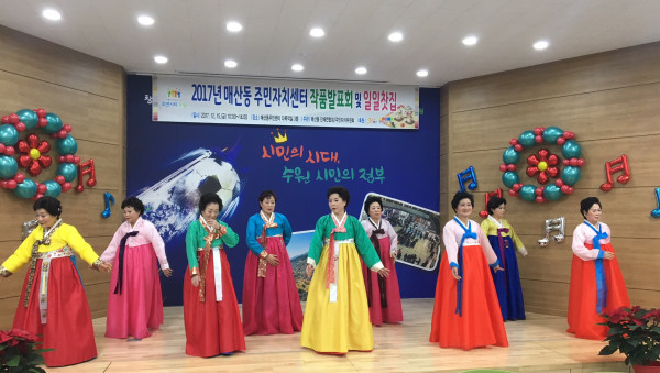 경기 수원시 팔달구 매산동은 최근 동주민센터 대회의실에서 지역주민, 단체원, 프로그램 수강생 등 300여명이 참여한 가운데 주민자치센터 작품발표회를 개최했다. 사진은 참여자들이 공연을 선보이는 모습. (사진제공=팔달구청)