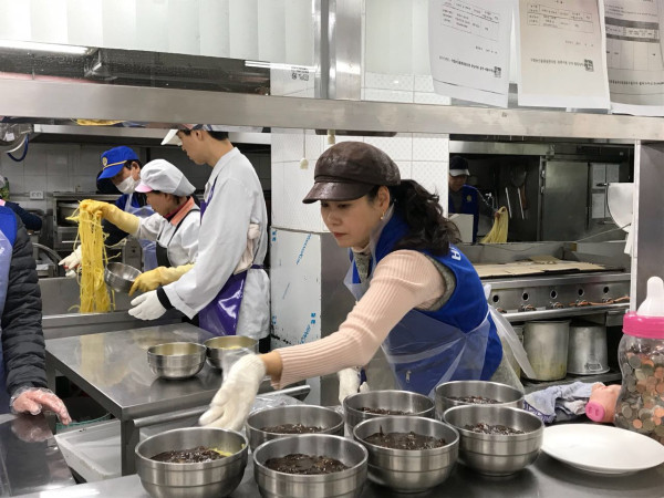 서울 성동구 마장동 바르게살기위원회는 연말을 맞아 지난 16일 지역내 음식점 양자강과 함께 지역내 홀몸노인 40여명을 초청해 짜장면과 갈비탕을 대접하는 행사를 진행했다. 사진은 자원봉사자들이 짜장면을 그릇에 담고 있는 모습. (사진제공=성동구청)