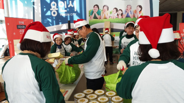 경기 용인시는 19일 오후 시청 로비에서 국제구호개발단체인 월드휴먼브리지와 함께 취약계층 임신부 100명에게 출산용품을 주는 크리스마스 선물 행사를 개최했다. 사진은 참여자들이 선물을 준비하고 있는 모습. (사진제공=용인시청)