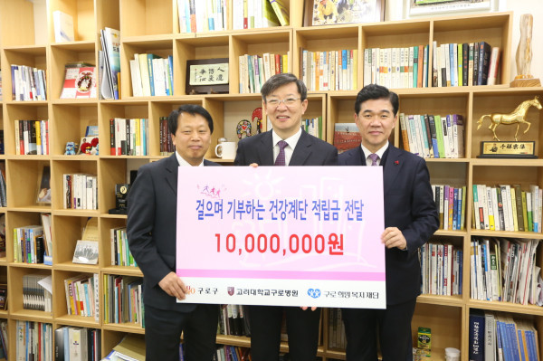 서울 구로구가 19일 구청 및 고려대학교 구로병원, 구로희망복지센터 관계자 등이 참석한 가운데 ‘건강계단 적립 기부금 전달식’을 개최했다. 사진은 행사에 참석한 관계자들이 기탁식 후 기념촬영을 하는 모습. (사진제공=구로구청)