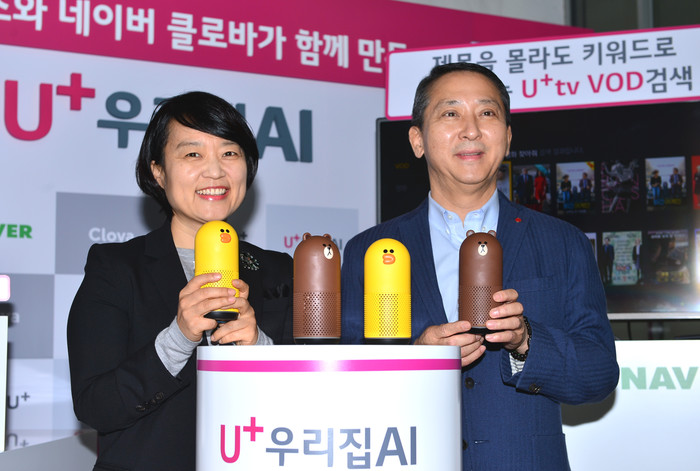 | ▲ 사진설명 : (오른쪽) 권영수 LG유플러스 부회장과 한성숙 네이버 대표이사가 ‘유플러스 우리집AI’ 서비스를 소개하고 있는 모습.(사진제공=LG유플러스) | ||