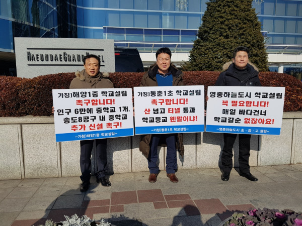 [인천=문찬식 기자] 인천시의회 공병건·김정헌·정창일 의원은 교육부 중앙투자심사위원회가 열리는 부산시 해운대구 현장을 방문해 피켓시위를 펼치며 초·중·고 학교신설을 촉구했다.