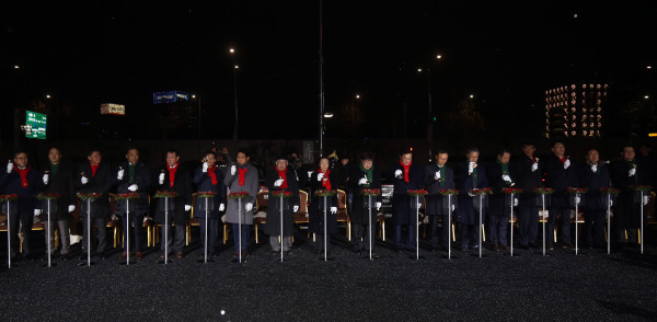20일 서울 강남구 코엑스 동측광장에서 ‘옥외광고물 자유표시구역 1호 미디어 점등식’이 개최됐다. 사진은 미디어 점등식에 참석한 주요 관계자들이 터치버튼 세리머니를 하고 있는 모습. (사진제공=강남구청)