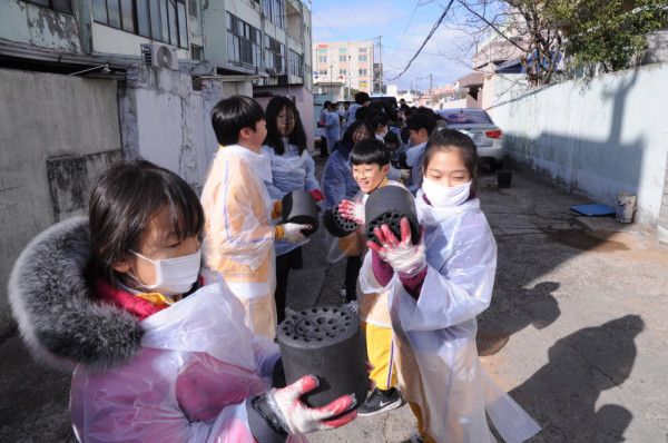 전남 광주교대목포부설초등학교 4~6학년 학생 240명은 지난 20일 희망나눔활동을 실천했다. 사진은 5학년 학생들이 알뜰 장터로 모은 돈으로 구입한 연탄을 학교 주변 마을 이웃에게 전달하는 모습. (사진제공=전남도교육청)