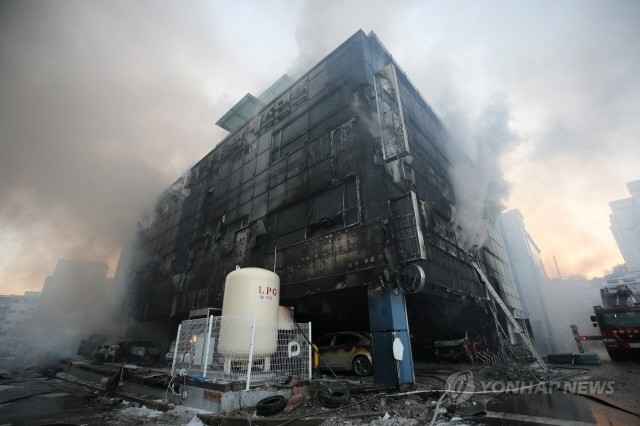 21일 오후 충 북 제천시 하소동 피트니스센터에서 불이 나 건물에서 연기가 뿜어져 나오고 있다.