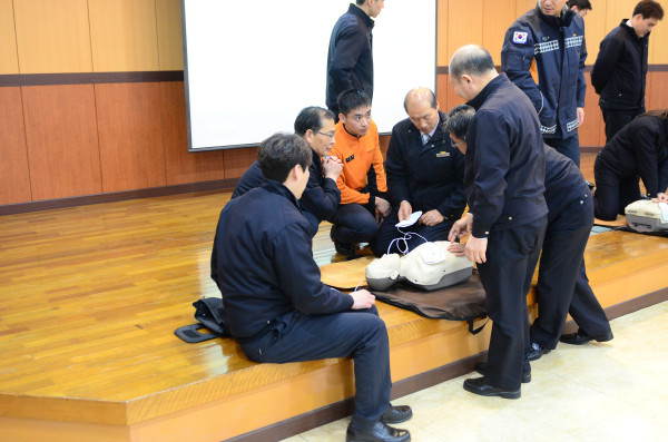 서울 영등포소방서는 22일 오전 소방서 대강당에서 전 직원을 대상으로 심폐소생술 교육 및 자동심장충격기 사용법 전문 교육을 실시했다. 사진은 소방서 관계자들이 자동심장충격기 사용법에 대해 배우고 있는 모습.(사진제공=영등포소방서)