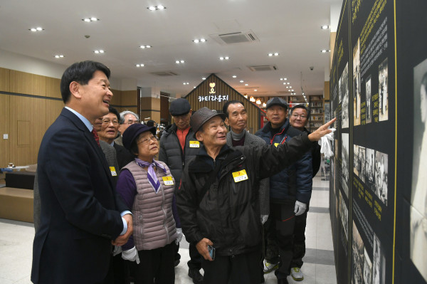 서울 중구는 중구토박이회와 함께 오는 29일까지 중구청 1층 로비에서 '추억의 토박이 사진전 <그땐 그랬지>를 진행한다. 전시회에서는 중구토박이들이 소장한 일제강점기부터 1960년대까지의 사진 70여점을 결혼, 가족, 학창시절 등 8개 주제로 나눠 공개한다. 사진은 토박이 노인이 사진에 얽힌 사연을 설명하는 모습.(사진제공=중구청)