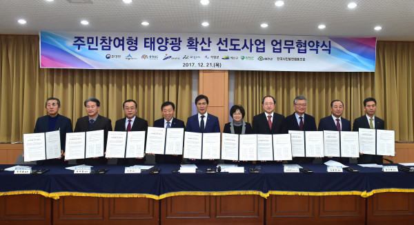 경기 안산시 '주민참여형 태양광 확산 선도사업 MOU' 체결 경기 안산시와 안산시민햇빛발전협동조합은 최근 예산군 물환경센터에서 '주민참여형 태양광 확산 선도사업 MOU'를 체결했다. 사진은 협약식에 참여한 관계자들이 기념 촬영을 하는 모습.(사진제공=안산시청)