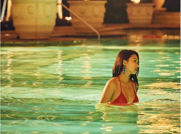 윤보라는 얇은 끈으로 이뤄진 레드 비키니로 볼륨감 넘치는 몸매를 뽐냈다. 특히 살짝 젖은 머리카락과 길게 늘어트린 귀걸이로 고혹적인 섹시미를 더했다.