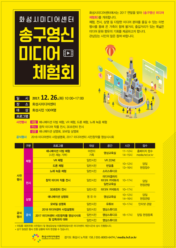 관계자는 “이번 '송구영신 미디어 체험회'는 누구나 참여가 가능하고 모두 무료로 진행된다”며 “특히 화성시미디어센터의 활동을 미리 들여다 볼 수 있는 <사업 설명회>를 통해 찾아가는 미디어 서비스 등 신규 프로그램 소개와 함께 ‘2018 교육 강사 풀 운영 및 채용 과정’ 설명회에 많이 신경 쓴 만큼 수강을 원하는 시민들뿐 아니라 교육 강좌 참여를 희망하는 ‘예비 강사’들의 많은 참여를 바란다”고 밝혔다.