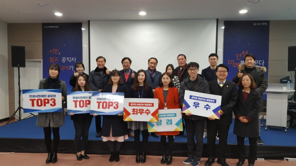 최근 경기 안성시는 안상맞춤아트홀 대회의실에서 시민들과 공무원들이 아이디어를 발표·공유하는 ‘안성시민 제안 한마당’ 발표대회를 개최했다. 사진은 발표회 시상식 후 참가자들이 기념촬영을 하는 모습. (사진제공=안성시청)