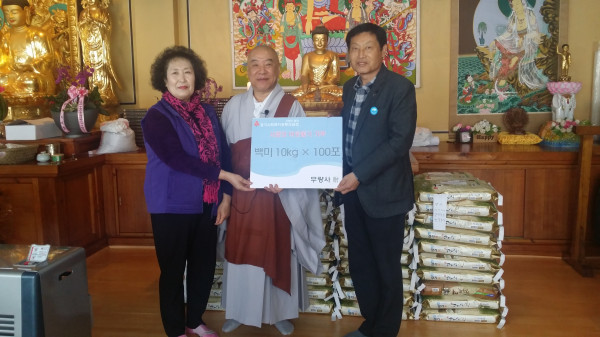 경기 양주시 백석읍 오산리 소재 무량사는 지난 22일 지역내 생활이 어려운 이웃들이 따뜻한 겨울을 보낼 수 있도록 한다는 취지에서 백석읍행정복지센터에 백미(10kg) 100포를 기탁했다. 사진은 기탁식 후 관계자들이 기념촬영을 하는 모습. (사진제공=양주시청)