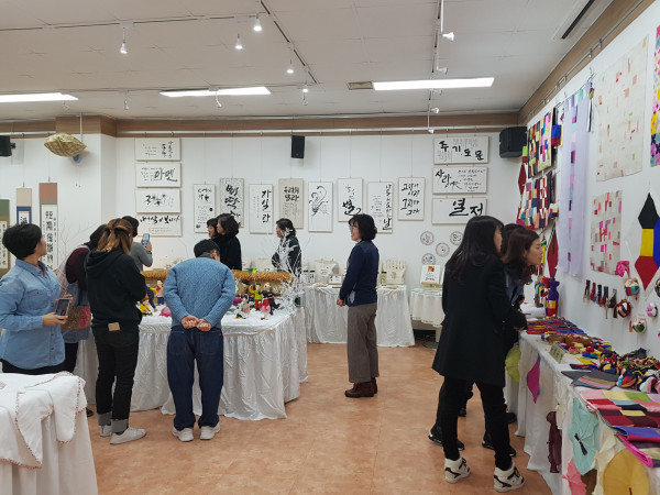 경기 안산시 여성비전센터는 지난 22일 하반기 모든 강좌를 끝내고 종무식을 개최했다. 이번 종무식에는 수강생 및 동아리생들이 그동안 교육을 통해 배운 한지공예, 홈패션, 한복작품 등 200여점이 전시됐다. 사진은 참여자들이 작품을 감상하는 모습. (사진제공=안산시청)