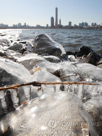 서울 낮기온이 영하권에 머문 26일 오후 서울 이촌한강공원 강변에 들이친 강물이 얼어붙어 있다. 기상청은 27일 아침 기온이 영하 10도 이하로 떨어지는 등 추위가 이어질 것으로 예상했다.