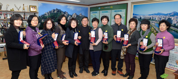 서울 노원구는 27일 세대간 모바일 정보 격차를 해소한다는 취지에서 ‘구민 스마트폰 교육’을 진행해 온 스마트봉사단원 11명에게 감사패를 수여했다. 사진은 감사패 수여식 후 관계자들이 기념촬영을 하는 모습. (사진제공=노원구청)