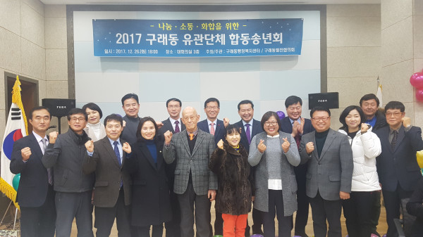 경기 김포시 구래동은 26일 동 발전협의회 주관으로 120여명의 내빈이 참석한 가운데 ‘2017 구래동 동정보고 및 유관단체 합동 송년회’를 개최했다. 사진은 행사에 참석한 관계자들이 행사 종료 후 기념촬영을 하는 모습. (사진제공=김포시청)