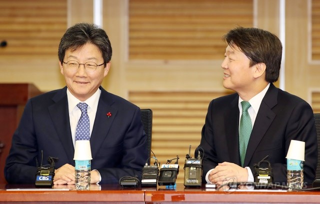 국민의당 안철수 대표가 27일 오후 국회 의원회관에서 바른정당 원외 지역위원장들의 초청으로 열린 간담회에 참석해 유승민 대표와 대화를 나누고 있다.