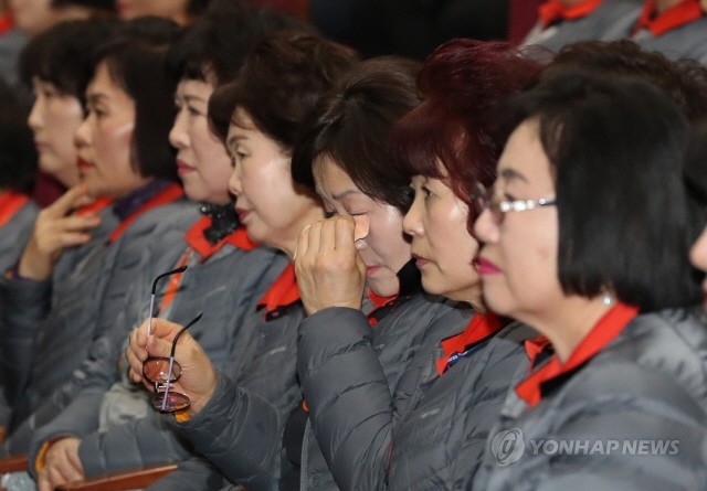 27일 오후 정부세종청사에서 열린 '정부청사 비정규직 근로자 정규직 전환 출범식'에서 근로자들이 정규직 전환 감격에 눈물을 흘리고 있다.