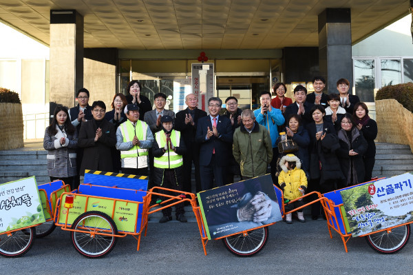 경기 여주시는 27일 폐지 줍는 노인을 지원하자는 취지에서 무게를 대폭 줄이고, 경광등·경음기 등을 부착해 만든 ‘더불어 리어카’의 전달식을 개최했다. 사진은 리어카 전달식에 참석한 시청 관계자와 지역주민 등 관계자들이 기념촬영을 하는 모습. (사진제공=여주시청)