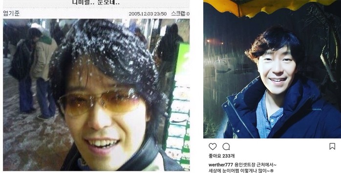 엄기준은 2005년 12월 싸이월드에 올린 것으로 추정되는 사진과 "니미럴 눈 오네"라는 다소 거친 비속어를 제목으로 함박눈을 맞고 있는 셀카를 올렸다