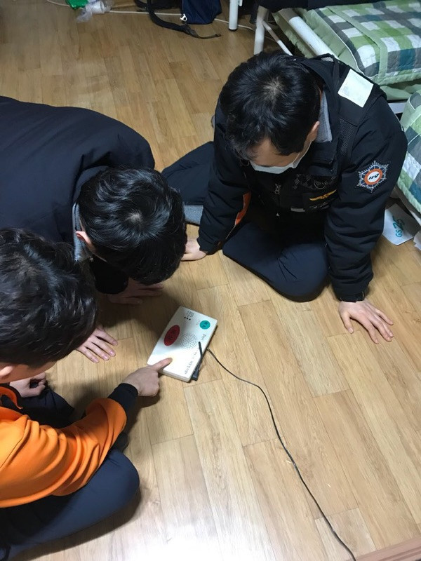 영등포소방서는 최근 구립율산 노인정 등 4곳에 설치된 무선페이징 시스템 단말기에 대한 일제 점검을 실시했다. 사진은 소방관들이 단말기를 점검하고 있는 모습. (사진제공=영등포소방서)