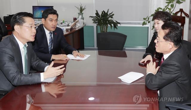 국민의당과 바른정당 '2+2 채널' 의원들이 2일 오후 국회 오신환 의원실에서 모임을 열고 ‘통합추진협의체’로의 전환에 대해 논의하고 있다. 왼쪽부터 국민의당 이태규 의원, 바른정당 오신환 원내대표, 국민의당 이언주 의원, 바른정당 정운천 최고위원.