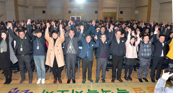 노원구는 2일 구청 대강당에서 ‘2018년 노원구 시무식’을 개최하고, 지난해 모범 직원 11명에 대한 표창한 후 구청 직원들의 소망을 듣는 시간을 보냈다. 사진은 시무식 종료 후 구청 관계자들이 신년 결의를 다지는 모습. (사진제공=노원구청)
