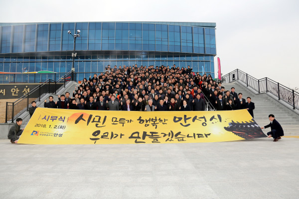 경기 안성시는 지난 2일 안성맞춤아트홀 소공연장에서 시장을 비롯해 시청 간부 및 직원 등이 참석한 가운데 ‘2018년 시무식’을 계최하고, 교류도시 축하메시지 상영과 청렴 결의대회 등을 진행했다. 사진은 시무식 종료 후 참석자들이 기념촬영을 하는 모습. (사진제공=안성시청)