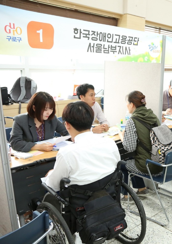 | ▲ 지난해 열린 구로구 장애인 일자리 박람회에서 상담을 받고 있는 구직자들 | ||