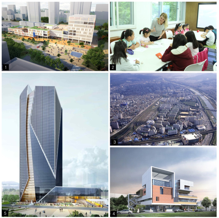 | ▲ 1. 서남권 거점도서관 조감도 2. 구로학습지원센터 영어회화교실에 참여한 어린이들 3. 구는 올해 구로차량기지 부지 지구단위계획을 수립할 계획이다. 사진은 구로차량기지 부지 전경 4. 오는 6월 완공 예정인 구로구 가족통합지원센터 조감도 5.정수장 부지 G밸리 지스퀘어 조감도 | ||