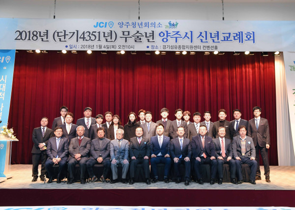 경기 양주시는 지난 4일 양주청년회의소 주관으로 경기섬유종합지원센터에서 ‘2018년도 무술년 신년교례회’를 개최하고 시의 발전과 시민의 화합을 기원했다. 사진은 신년교례회에 참여한 관계자들이 기념촬영을 하는 모습.(사진제공=양주시청)