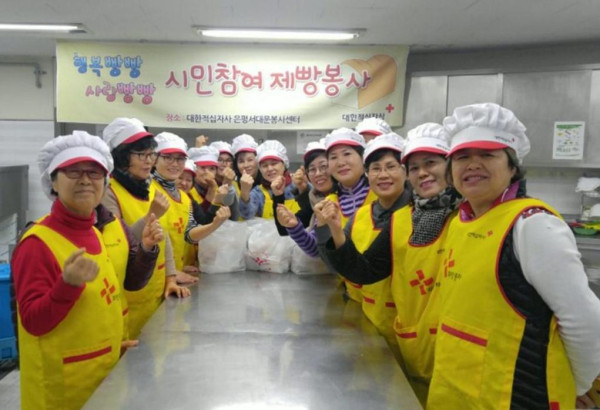 | ▲ 최근 '사랑의 빵 만들기' 봉사활동을 펼친 충현동 통장협의회 회원들이 포즈를 취하고 있다.(사진제공=서대문구청) | ||