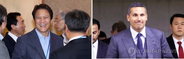 임종석 대통령 비서실장이 8일 오후 청와대에서 열린 수석보좌관회의에 입장하고 있다(사진 왼쪽). 사진 오른쪽은 정세균 국회의장을 예방하기 위해 국회에 도착한 아랍에미리트(UAE) 모하메드 빈 자이드 알 나흐얀 왕세제의 최측근인 칼둔 칼리파 알 무바라크 아부다비 행정청장. 칼둔 청장은 방한 기간 임 실장을 면담하는 데 이어 문재인 대통령을 직접 예방할 것으로 전망된다.