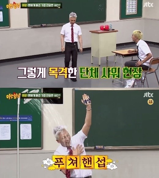 태양은 "그런데 목욕탕 아니냐. 곧 씻어야 하는데 손바닥에 사인을 했으니 금방 지워지지 않을까 궁금증이 생겼다. 그래서 몰래 봤는데 20명이 한 손을 들고 샤워를 하고 계셨다"라고 덧붙여 웃음을 자아냈다.