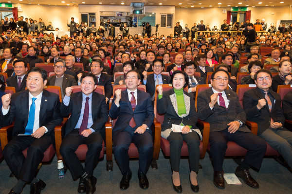 8일 서울 양천구 양천문화회관 대극장에서 구정비전을 제시하고 새해를 다짐하기위한 '2018년 무술년 양천구 신년인사회'가 개최됐다. 사진은 구청장, 구의장, 서울시장, 주민들이 새해 다짐을 하며 화이팅을 외치고 있는 모습. (사진제공=양천구청)