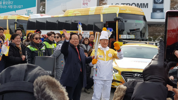 경기 광주시는 지난 7일 수원·용인시에 이어 3번째 주자로 ‘2018평창동계올림픽 성화 봉송’ 행사를 개최하고, 곤지암리조트에서 출발해 남한산성과 광주시청을 거쳐 청석공원에서 마무리되는 구간에서 성화 봉송을 진행했다. 사진은 성화를 봉송하는 관계자들의 모습. (사진제공=광주시청)