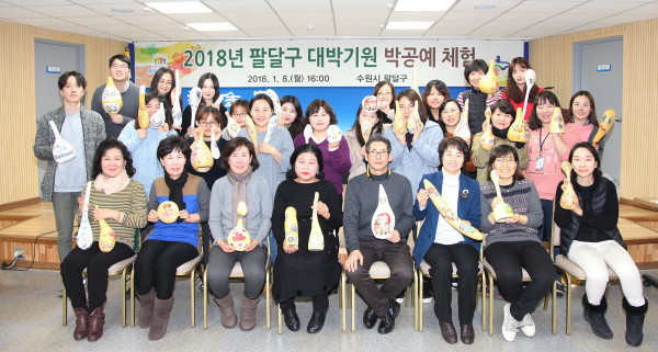 경기 수원시 팔달구는 8일 구청대회의실에서 직원과 주민 50여명이 참여한 가운데 박공예 체험행사를 가졌다. 이날 행사에 사용된 박은 지난해 팔달구청을 찾는 시민들의 쉼터 역할을 했던 대박터널에서 수확한 박을 활용한 것이다. 사진은 참여자들이 박공예품을 들고 기념촬영을 하는 모습.
