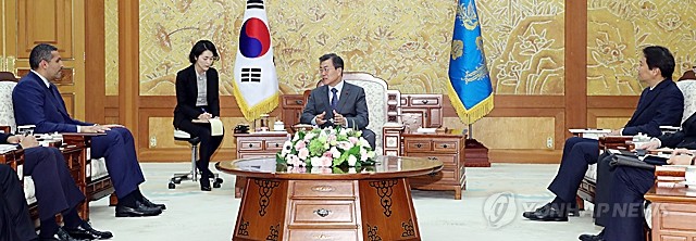 문재인 대통령이 9일 오후 청와대에서 아랍에미리트 왕세제 특사 자격으로 방한한 칼둔 칼리파 알 무바라크 아랍에미리트(UAE) 아부다비 행정청장을 만나 얘기를 나누고 있다. 오른쪽은 임종석 비서실장.