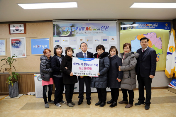 경기 연천군 군남·미산·왕징면 한우농가들의 모임인 ‘파주연천축협 임진한우리회’는 10일 새해를 맞이해 지역내 저소득 취약계층을 위해 사용해달라며 성금 200만원을 연천군에 기탁했다. 사진은 기탁식 후 관계자들이 기념촬영을 하는 모습. (사진제공=연천군청)