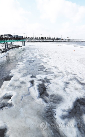 전국에 한파가 몰아친 11일 오전 경기도 화성시 서신면 궁평항 주변 바닷가가 꽁꽁 얼어 있다.