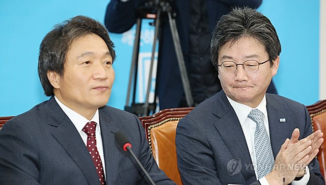 바른정당 유승민 대표가 11일 오전 국회에서 열린 최고위원ㆍ국회의원 연석회의에서 당 잔류를 선언한 이학재 의원의 발언을 듣고 박수 치고 있다.