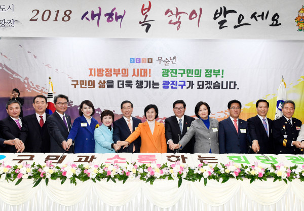 광진구는 11일 오후 2시 구청 대강당에서 ‘2018년 광진구 신년인사회’를 개최했다. 사진은 행사에 참석한 내빈들이 축하 시루떡 절단식을 하는 모습. (사진제공=광진구청)
